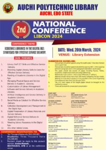 Auchi Polytechnic Library will be holding its’ 2nd National Library Conference (LIBCON) with a conference theme titled; ACADEMIC LIBRARIES IN THE DIGITAL AGE: STRATEGIES FOR EFFECTIVE SERVICE DELIVERY.